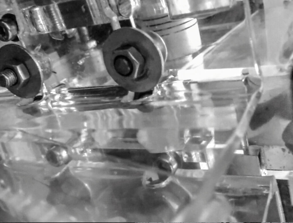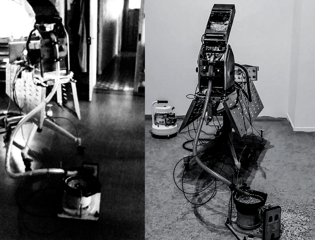 Les dents s’acheminent vers le bol trieur une par une grâce à une roue à aubes. Elles suivent alors le manège mécanisé du monde cybernétique, tournent en spirale, gravissent peu à peu la rampe de sortie du bol, retombent et finissent par être évacuées (par des souffleurs robotiques) en une mort symbolique, sur le sol périphérique de l’installation jonché de dents.