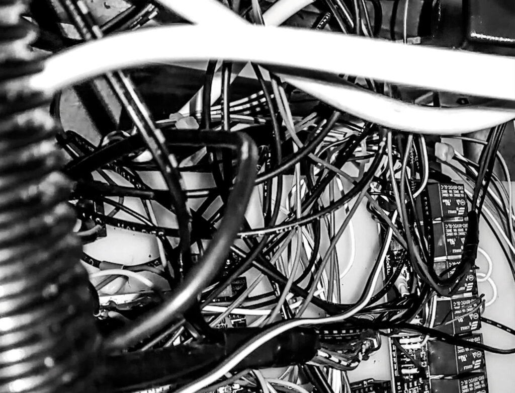 Une machine, avec des actionneurs robotiques, un bol trieur industriel, des tubulures, des câblages électriques, des capteurs de passages, de présences, d’arrivées et de départs.